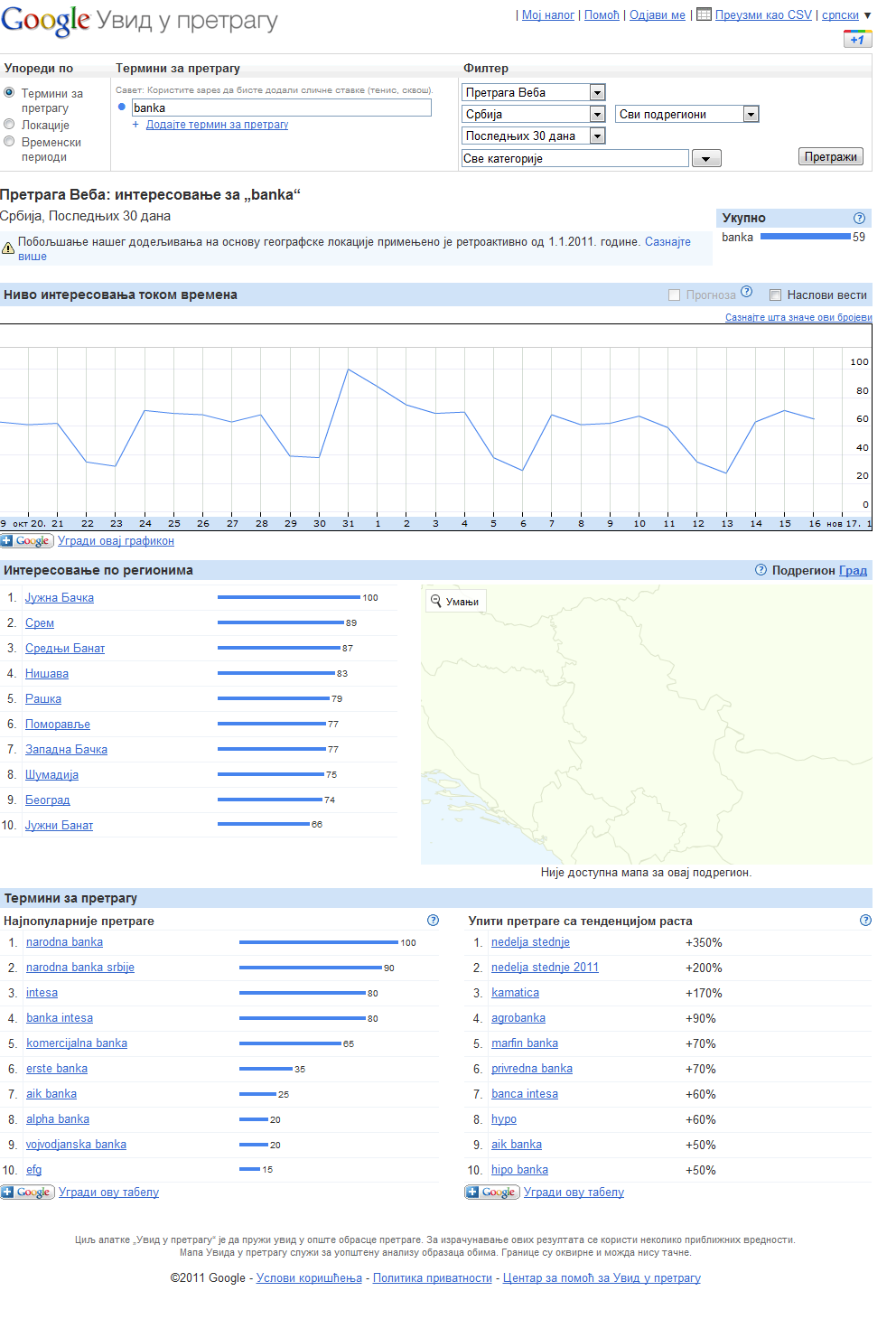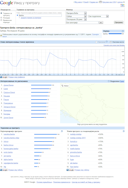 На следећој слици видећете резултате Google Увида у претрагу када тражимо реч "banka" за последњих 30 дана.